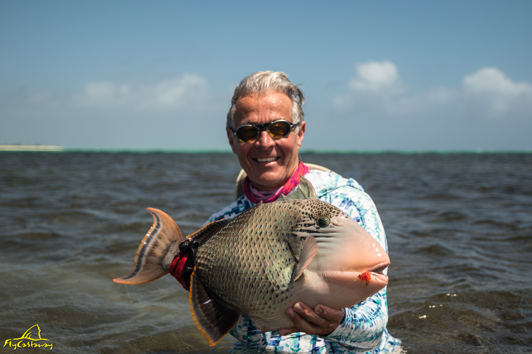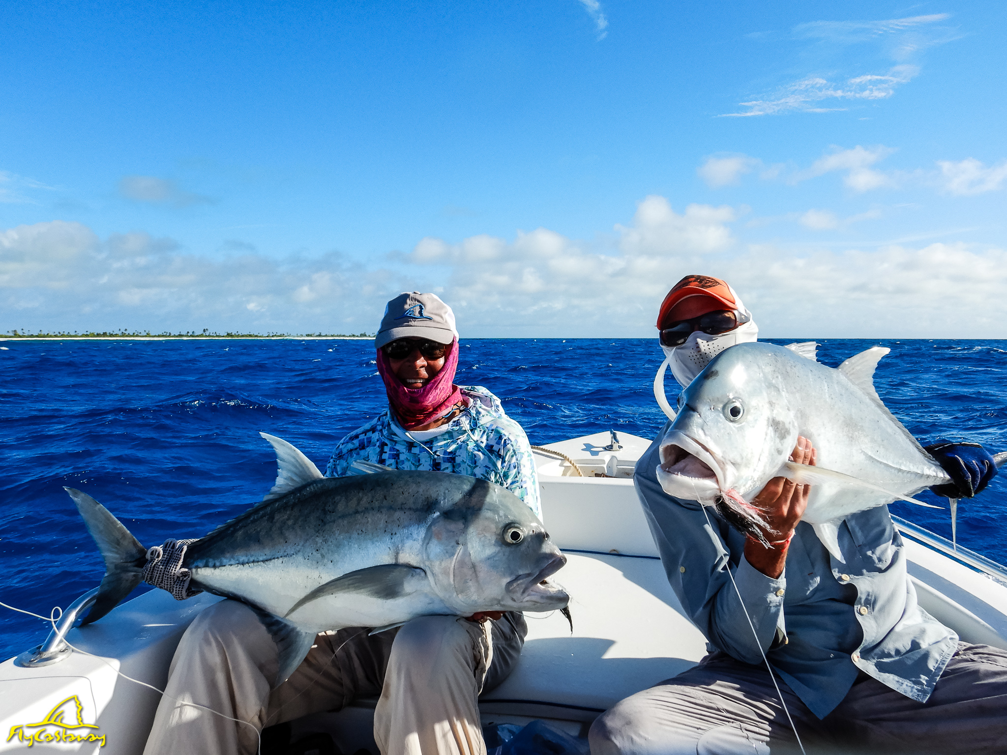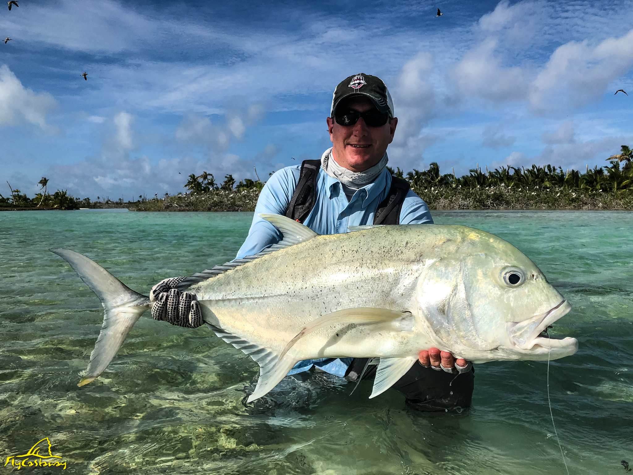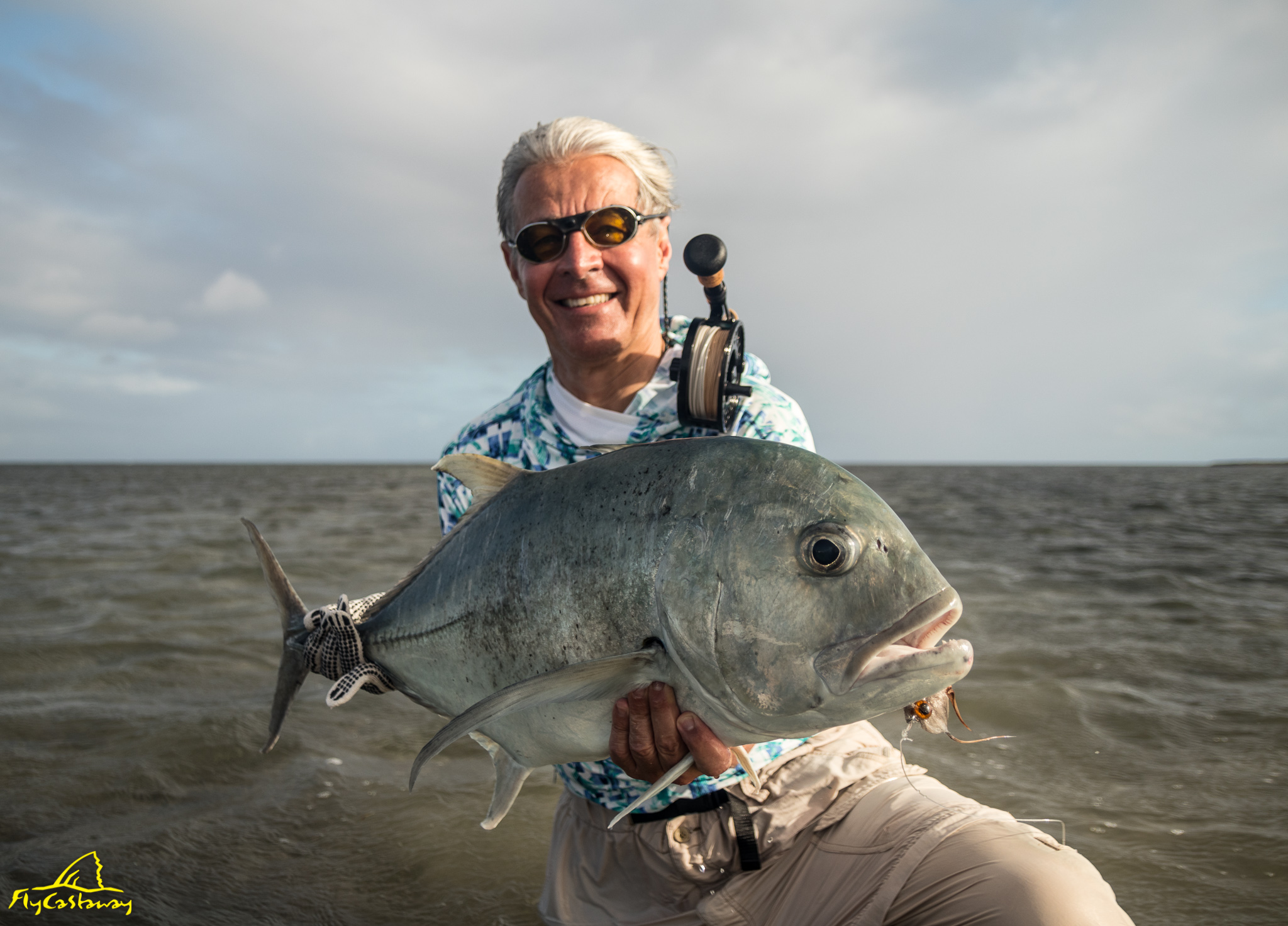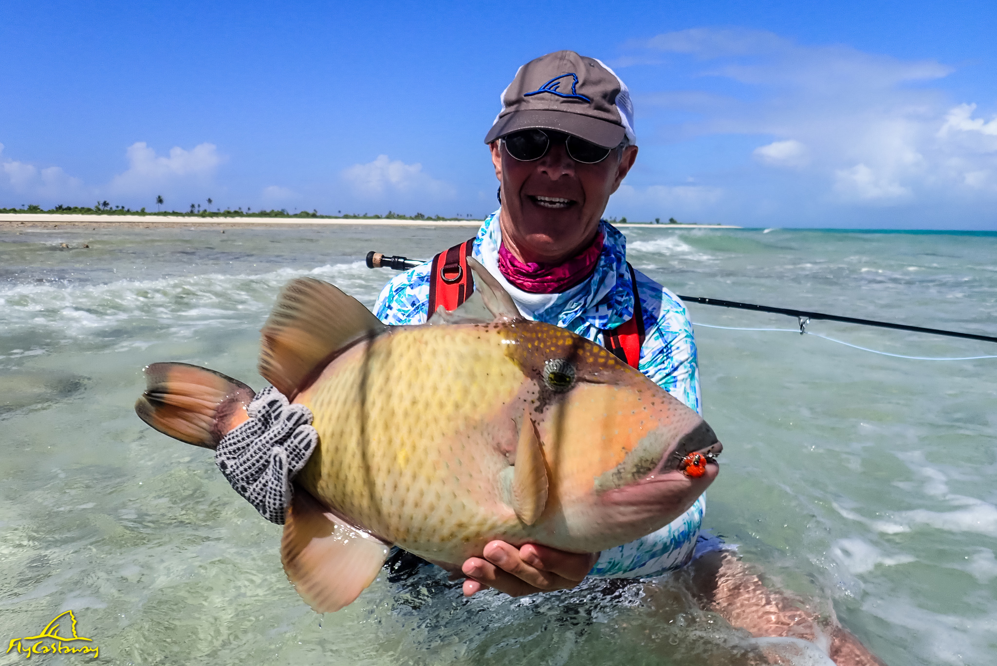 With the afternoon high water our guests drifted over coral heads and got to tussle with many reef dwelling fish as the species count for the week was really good. Father and son Jonathan and Thomas had a great week, which saw father Tom hook a massive GT on Day 1 only to lose it at the end of the fight as the fish cut him off. Thomas managed to land a Moustache triggerfish on the 4th day and son Jonathan managed to convert his shots landing 2 fish with the biggest being 104cm. Another Father and son pairing Stephan and Benjamin had a good week as they both hooked numerous GTs with son Benjamin loosing 3 in 1 day. First time salt water fly fishing John had a start to remember as he landed a 108cm GT on the first day of the week and went on to land another one. Erik was unlucky with the GTs this week, hooking a few but none coming to hand, but he enjoyed some great bone fishing with a few solid grouper and snapper species. Doug got his GT on the 3rd day landing a fin perfect fish. Terrel hooked 5 GTs before landing his 1st on fly! Fishing buddies Donald and Bill had a fantastic week which saw Bill achieving a Trigger slam on the first day of the week – a Moustache triggerfish, a nice GT and a bonefish to top it off. It got even better for him as after losing 3 GTs in a day himself and Donald managed to double up on a pair of GTs in the deep blue during the final afternoon session. Donald had a great week as he also got a trigger slam – a yellow margin triggerfish, a nice GT and a bone. He also managed to cap off his week with another GT and a moustache triggerfish!