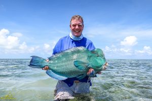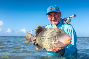 The fifth day dawned gloomy and with a stiff south easterly breeze. With an early morning neap low tide the boats set out. The clients managed to capitalize on the tailing species with 2 Bumpies and 1 Triggerfish being landed. Vladimir and Vadim managed to land a Bumpie each following which Vadim landed a big Moustache Triggerfish as well. The sole GT of the day went to Alex.