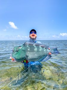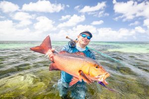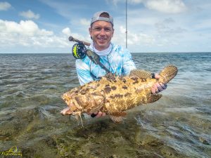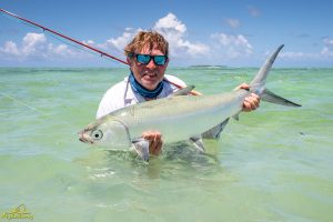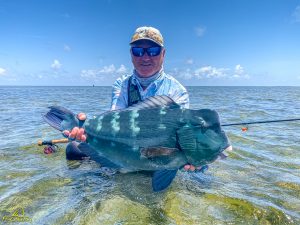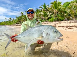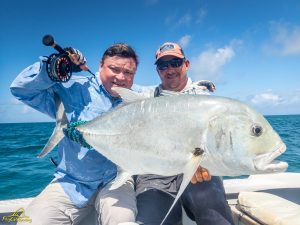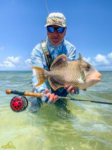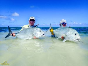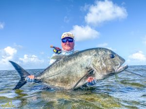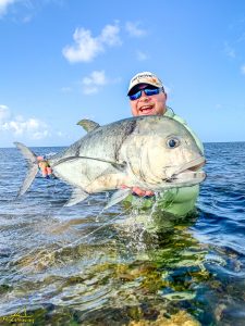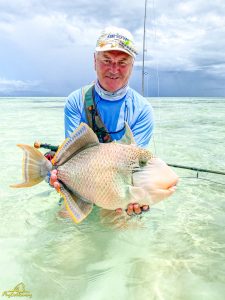 The third day saw clear skies and a slight south easterly breeze. Again, another exceptional day of GT fishing was enjoyed by all, with 14 fish being landed. Sergey G, Mike, Alex, Igor, Vadim, Maxim, Sergey G and Vladimir managed to all catch fish. The fish of the day went to Vladimir who after stationing up on a cut in the flat, saw a school of six GTs move into the shallow water. After presenting the fly it was hounded down and engulfed by the lead fish. The fish stripped a lot of backing through a lagoon before it was subdued and measured at 111cm. It was a GT of a lifetime, well done Vladimir. Vladimir also had a stellar day on the tailing Triggerfish, landing four fish for the morning. Vadim was not finished either and managed to land his first Triggerfish for the trip. A rare event later unfolded as Mike and his guide managed to hook and land a Milkfish that was tailing in the shallows of the flat, bringing the Milkfish tally to 2 for the week. A very special moment!