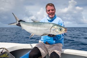 The final day of the trip brought again gloomy skies with a stiff south easterly breeze. Dennis managed to land the first Sailfish of the week, his second following shortly afterwards. A total of 2 GTs were landed for the day, one going to Mike and the other going to Vladimir. Vadim managed to land his 3rd Bumpie for the week. This brought to a close another highly enjoyable and successful week out on Providence!