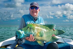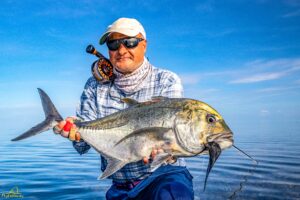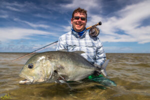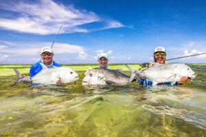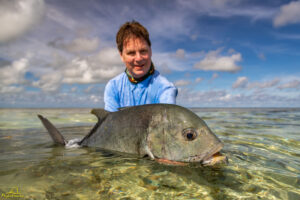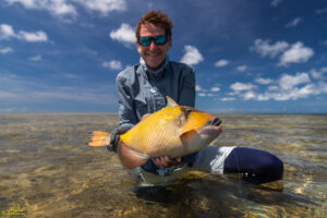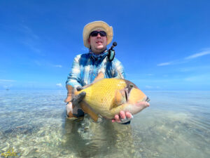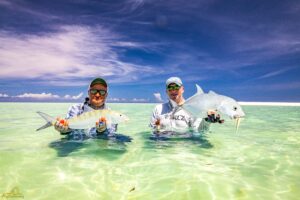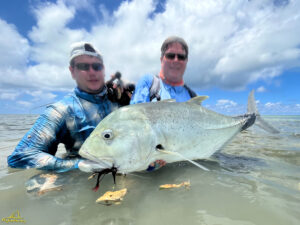 Along with all the action on the tailing fish species front was the exciting number trevally encountered during each day on the flats. Although we were unable to convert the opportunities we had for the atoll’s massive GTs, the Bluefin trevally were more obliging with our group landing 5 trophies for the week. The standout catches on this front went to Steven and Matt who both landed fish that stretched the measuring tape to 75cm.