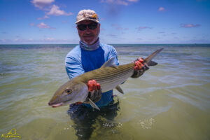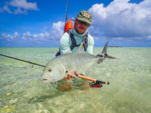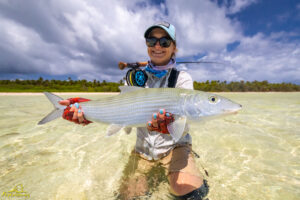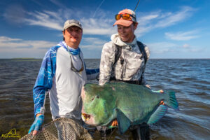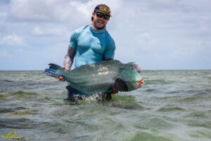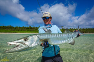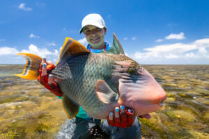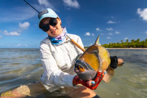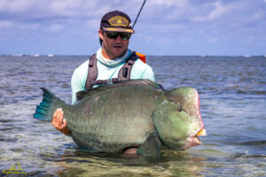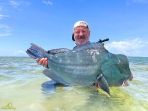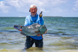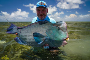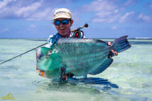 The sixth and final day of the fishing week saw our guests enjoy bluebird skies and very little wind. The conditions, perfect for sight fishing, delivered a total of 19 GTs landed. Margaret enjoyed the standout catch with an incredibly powerful 103cm GT, picked from a school that was found staging up on the edge of the atoll, nicely done Margaret! The Bumphead Parrotfish were encountered in good numbers resulting in both Mark and Vaughn completing there first ever Bumphead catches… Well done gents! The Milkfish were again found feeding heavily on the outer rim of the atoll, Alex and Duncan going on to land one each… their first ever on the fly. Excellent job guys.