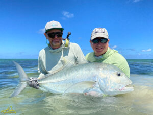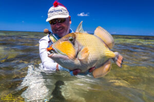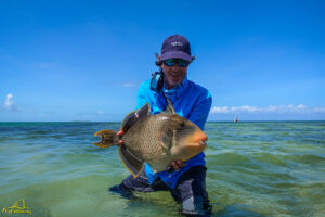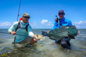 The second day saw a total of 12 GTs landed, with a special mention for Will who experienced the thrill of shallow water GT fishing when he connected to a large fish that had been seen tailing on the edge of a lagoon. His beauty stretched the measuring tape to 100cm on the dot… well done Will! Gerry experienced something similar when he managed to entice a massive fish from a school to eat his fly, and following an intense battle the landed fish measured an impressive 109cm… well done Gerry! The tailing fish species were also encountered in good numbers resulting in Kris and Chris each landing their first Triggerfish on the fly. Well done gentlemen!