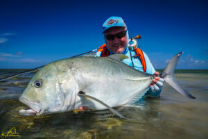 The first day dawned with a slight breeze and bluebird skies resulting in perfect sight fishing conditions. It turned out to be a day of firsts for our guests who got into swing of things from the moment their feet hit the flats, with Mark, Margaret, Vaughn, Duncan and Will all landing their first GTs on the fly. By the time all our tender boats had returned to the mothership on the first evening, we had amassed a total of 19 GTs for the day…a great start!